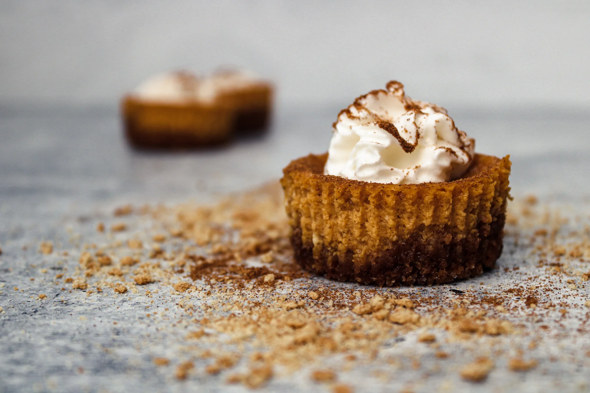 Bake baby. Bake at 350 degrees Fahrenheit for 18-20 minutes, or until the cheesecakes have set. Turn off the oven and leave the cheesecakes in there to cool for 20 more minutes with the door shut. Then remove these golden lil beauties from the oven and let cool completely before chilling for at least 2-3 hours before serving. If the centers have sunk a lil bit, don’t worry it happens and is easily covered up with toppings! For some wow-factor presentation, top the mini cheesecakes with whipped cream and pumpkin pie spice before serving. Enjoy this yummy fall-themed dessert.