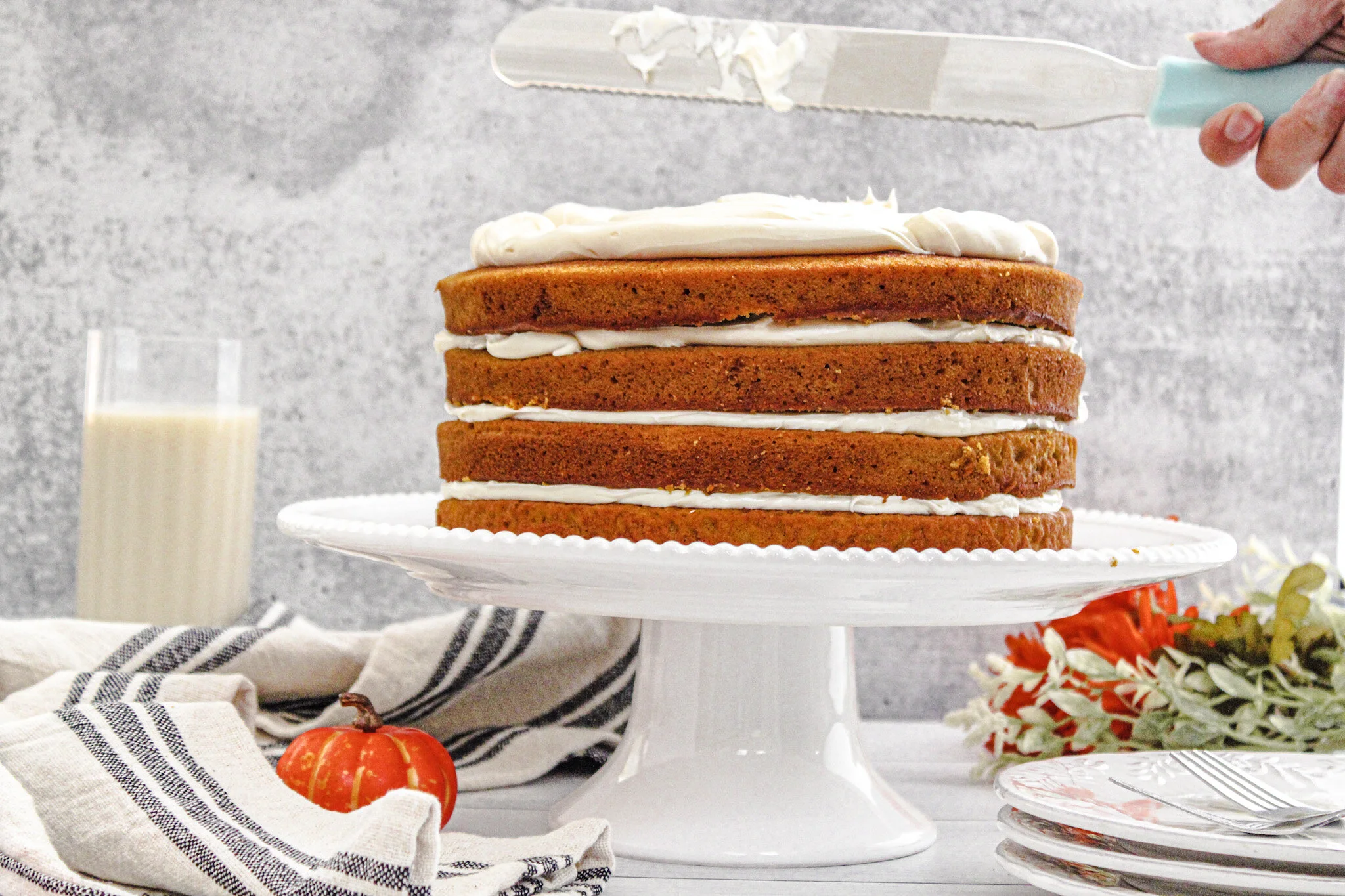 One of the best parts of the new season is the sheer amount of inspiration I’m getting for this blog. I’m so ready to create new autumnal-themed recipes and to photograph gorgeous treats for you all. Even though it’s not technically fall until next week (September 22nd—mark your calendars!), I’m already jumping on the bandwagon and publishing new recipes. And for my first official fall recipe, I had to do it justice with a stunning pumpkin cake.